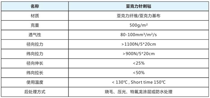 亞克力針刺氈是采用非織造針刺工藝利用亞克力較強纖維交錯排列,空隙分布均勻的細纖維布表面經熱 軋、燒毛等處理,使其表面平整光滑,不易被粉塵所堵塞,此濾料空隙大。透氣性能好,抗化學穩定性強, 不僅可以過濾常溫氣體,而且過濾中溫氣體(150°C)同時是酸堿腐蝕性氣體工況過濾材料的理想選擇。